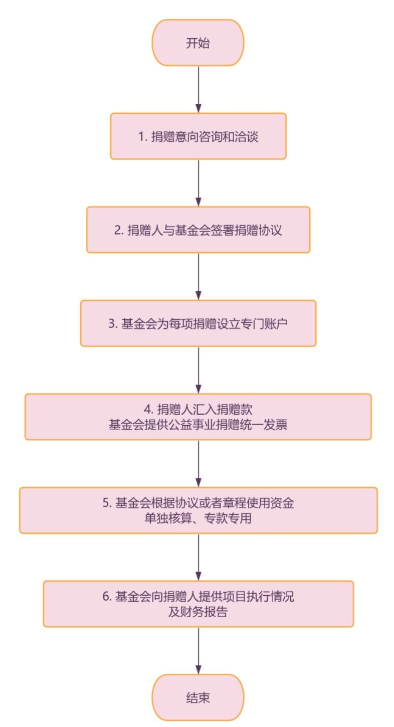 该流程图展示了基金会捐赠的全流程管理:从前期的意向洽谈与协议签署开始,通过设立专门账户和开具捐赠...